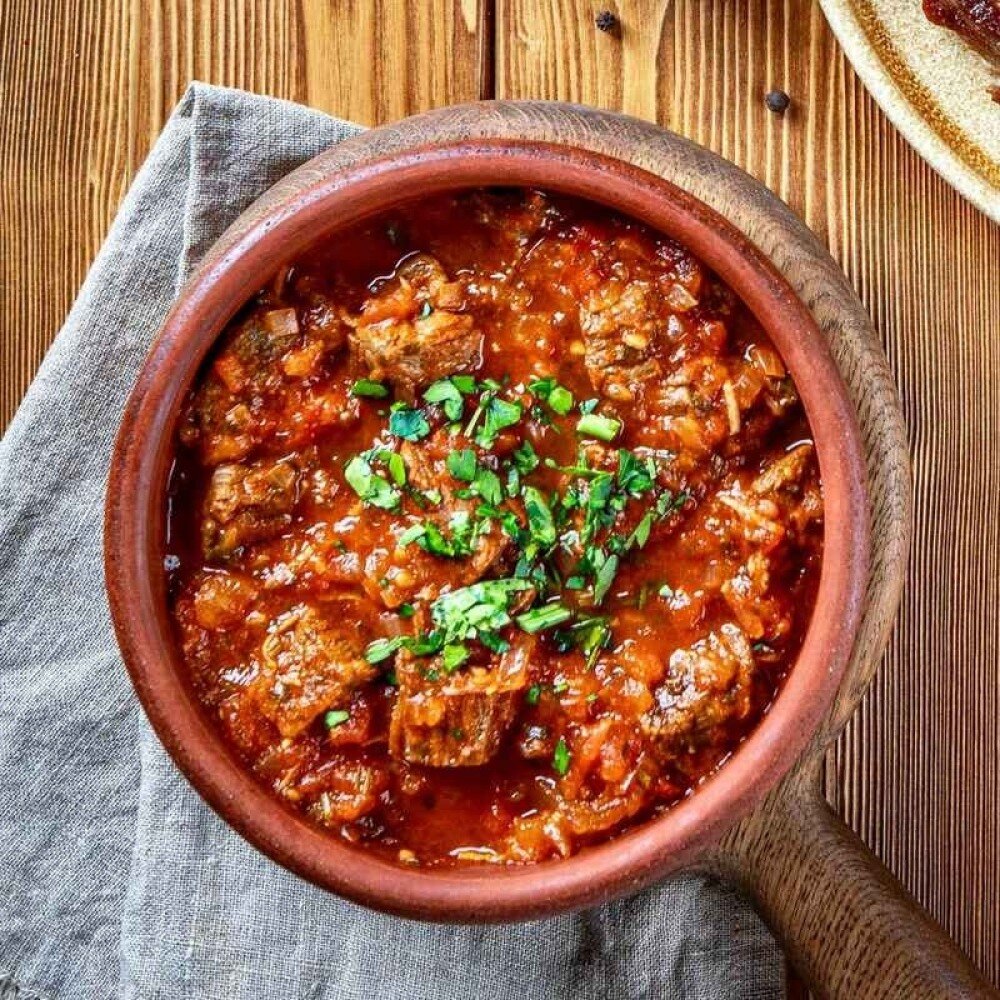 Говядина, тушеные помидоры, сладкий перец, лук, чеснок.