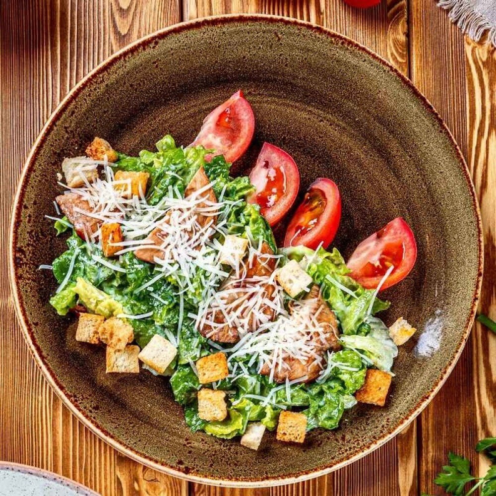 Филе курицы, листья салата айсберг, фирменный соус, помидоры, сыр, крутоны.