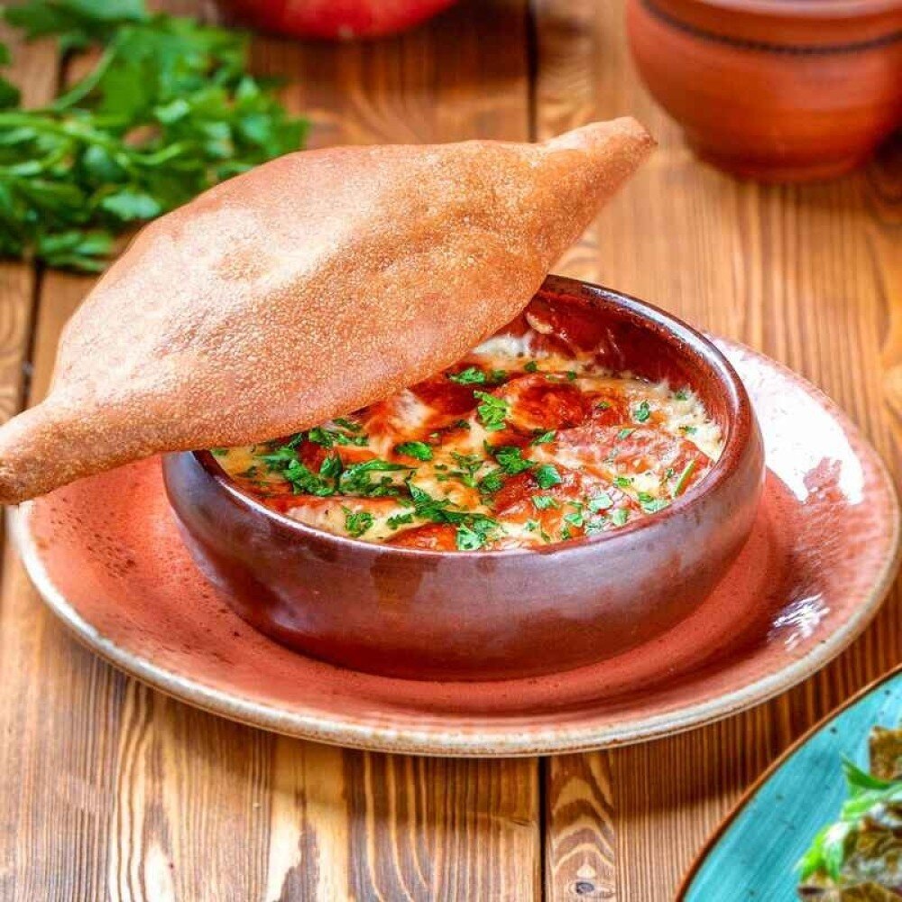 Горячая закуска из запеченного сыра и томатами. Подается с грузинским хлебом Шотис пури.