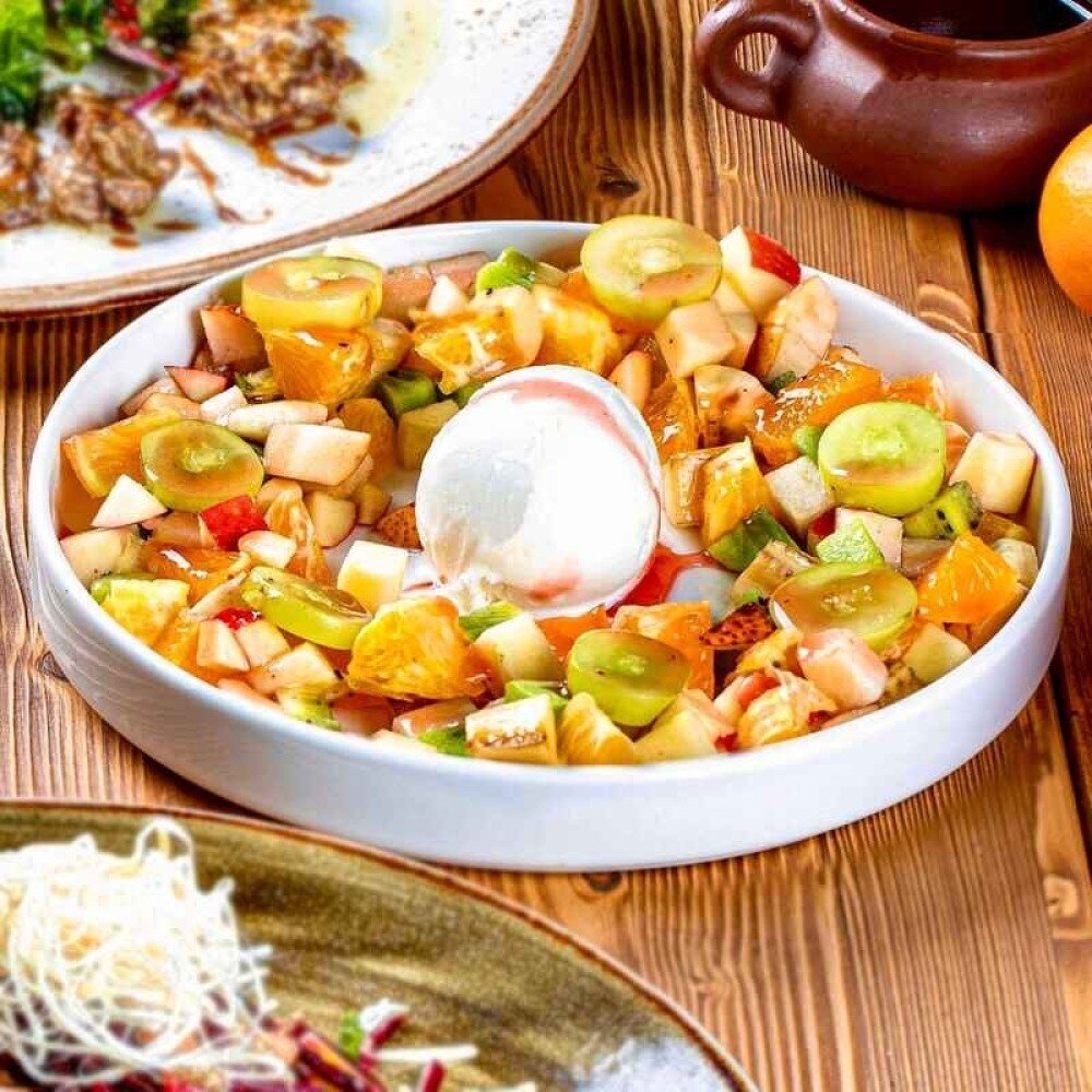 Мелка нарезанные бананы, яблоки, апельсины, киви, виноград, груша под клубничным топингом. Подается с шариком мороженого и укрошается мятой.