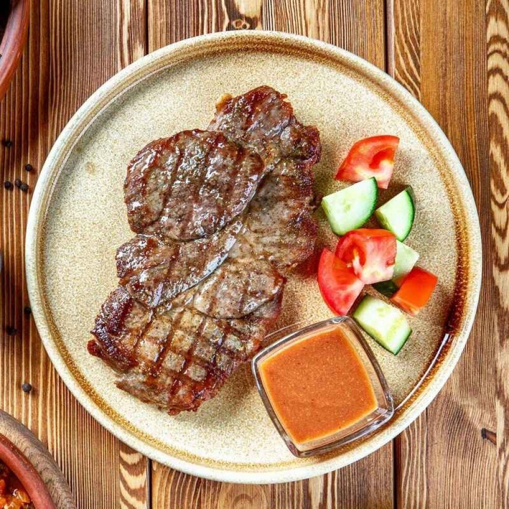 Сочный и ароматный стейк из свинной шеи с салатом из свежих овощей - огурец, помидор, перец, с фирменным соусом. Точно не оставит равнодушным ни одного джигита.