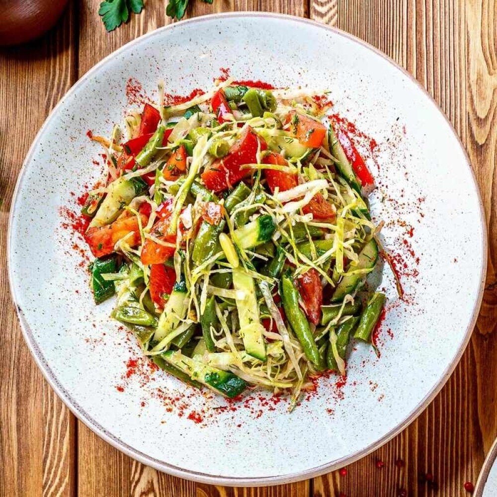 Овощной салат из белокачаной капусты, болгарского перца, стручковой фасоли, томатов, огурцов, заправленный пикантным соусом.