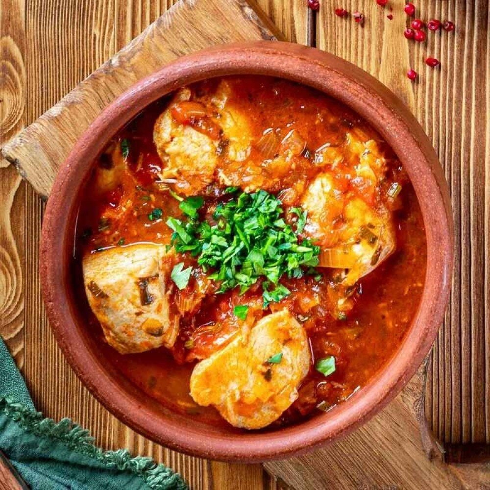 Невероятно вкусное грузинское блюдо из куриных бедер и сочными овощами: лук, болгарский перец, помидоры, чеснок. Никого не оставит равнодушным.