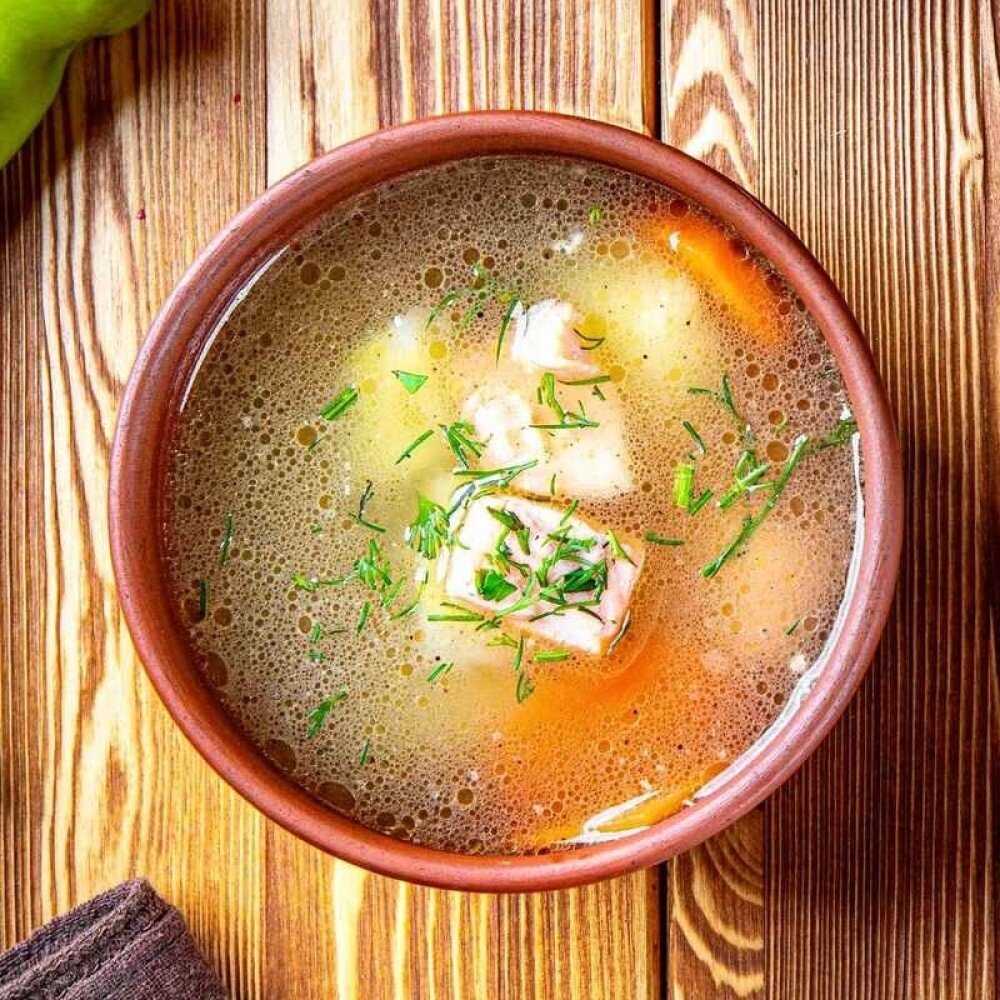 Классический рыбный суп из свежего лосося и щуки, с картофелем и морковью.