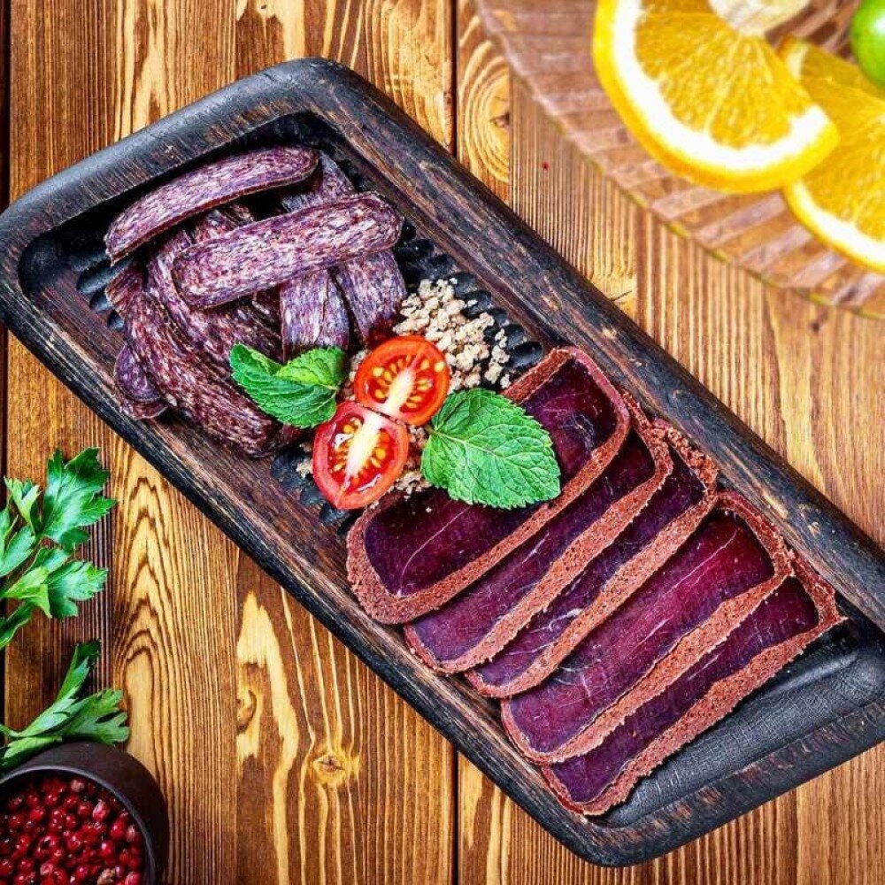 Традиционные грузинские мясные деликатесы суджук и бастурма с орехами.