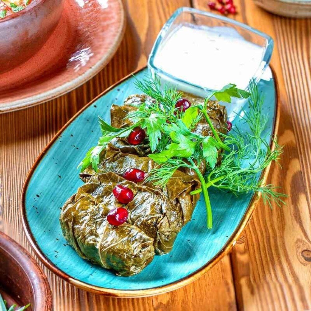 Мини голубцы с начинкой из баранины с добавлением риса, зелени и специй заверные в виноградные листья. Подаются с сметаной.