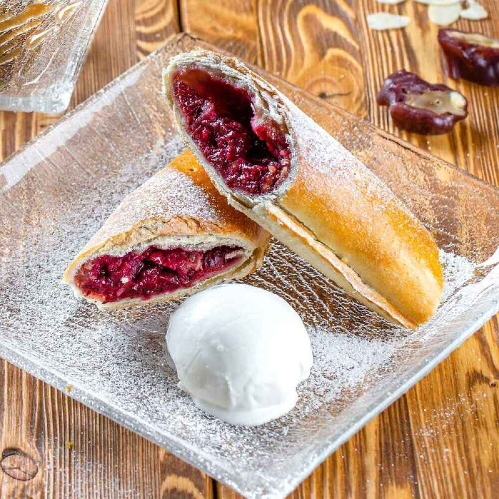 Классический штрудель с начинкой из вишни и грецкого ореха. Подается с шариком мороженого.