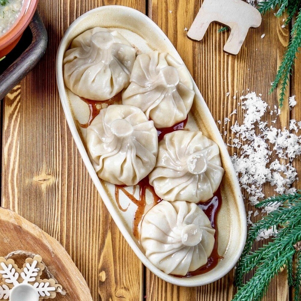 Нежные хинкали с сочной начинкой из оленины с луком и ароматными специями. Свежесть кинзы подчеркивает благородный вкус мяса. Идеально сочетаются с брусничным соусом, который добавляет яркую кисло-сладкую ноту.